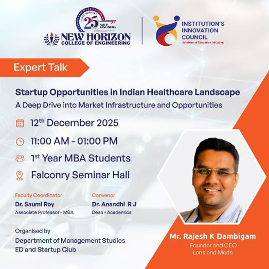 EDC – NEWS Expert talk- Startup Opportunities in the Indian Healthcare Landscape The Department of Management Studies with the ED & Startup Club, and the Institution’s Innovation Council organised an expert talk on 12 December 2025 titled Startup Opportunities in the Indian Healthcare Landscape. The session, delivered by Mr. Rajesh K. Dambigam, Founder and CEO, Lens […]