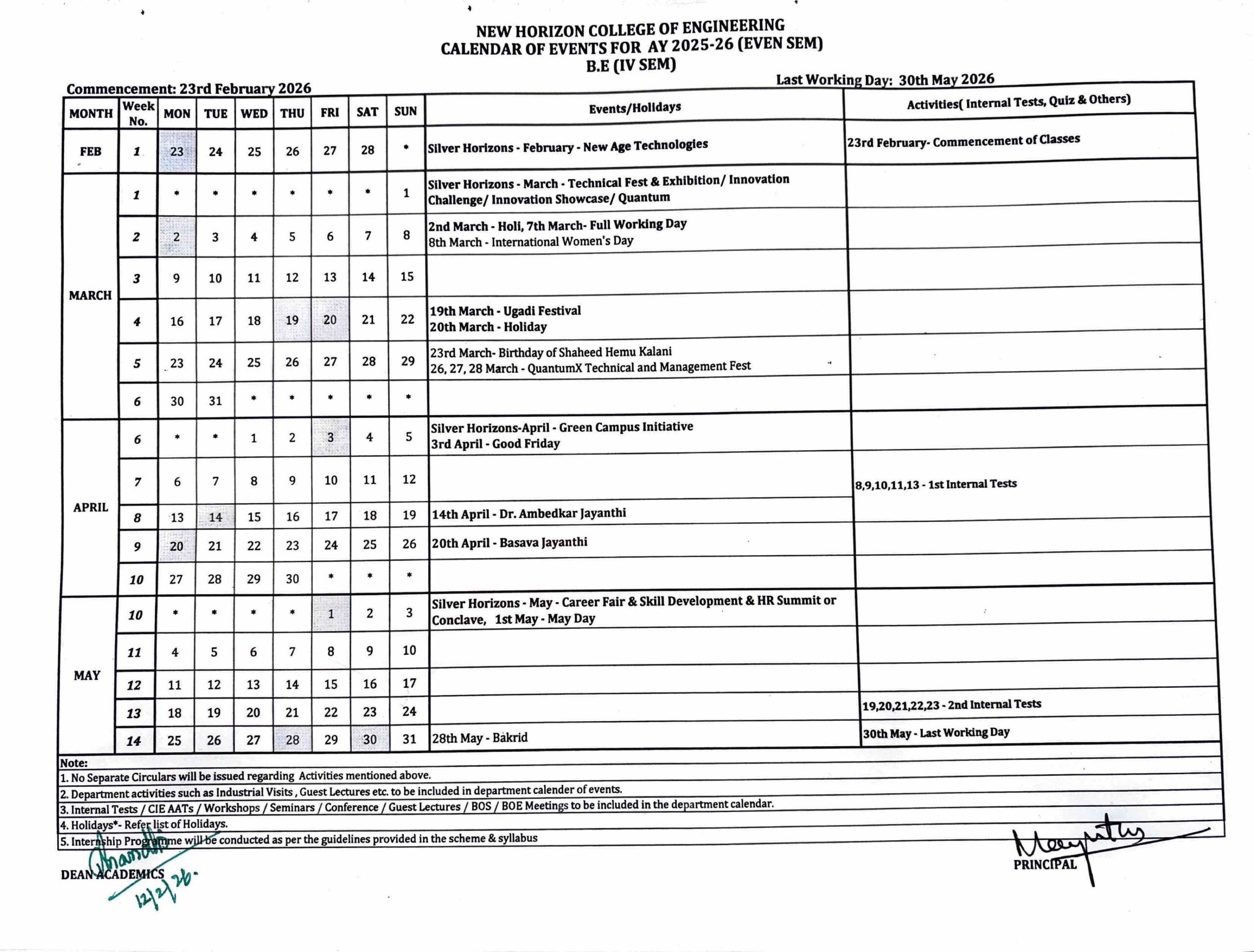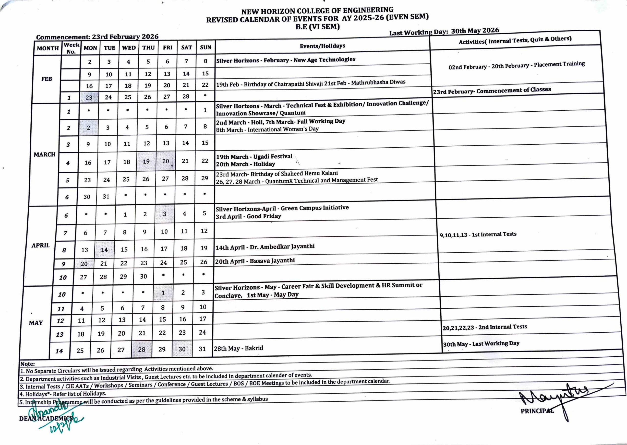 - 2nd & 6th Sem BE Calendar of Events