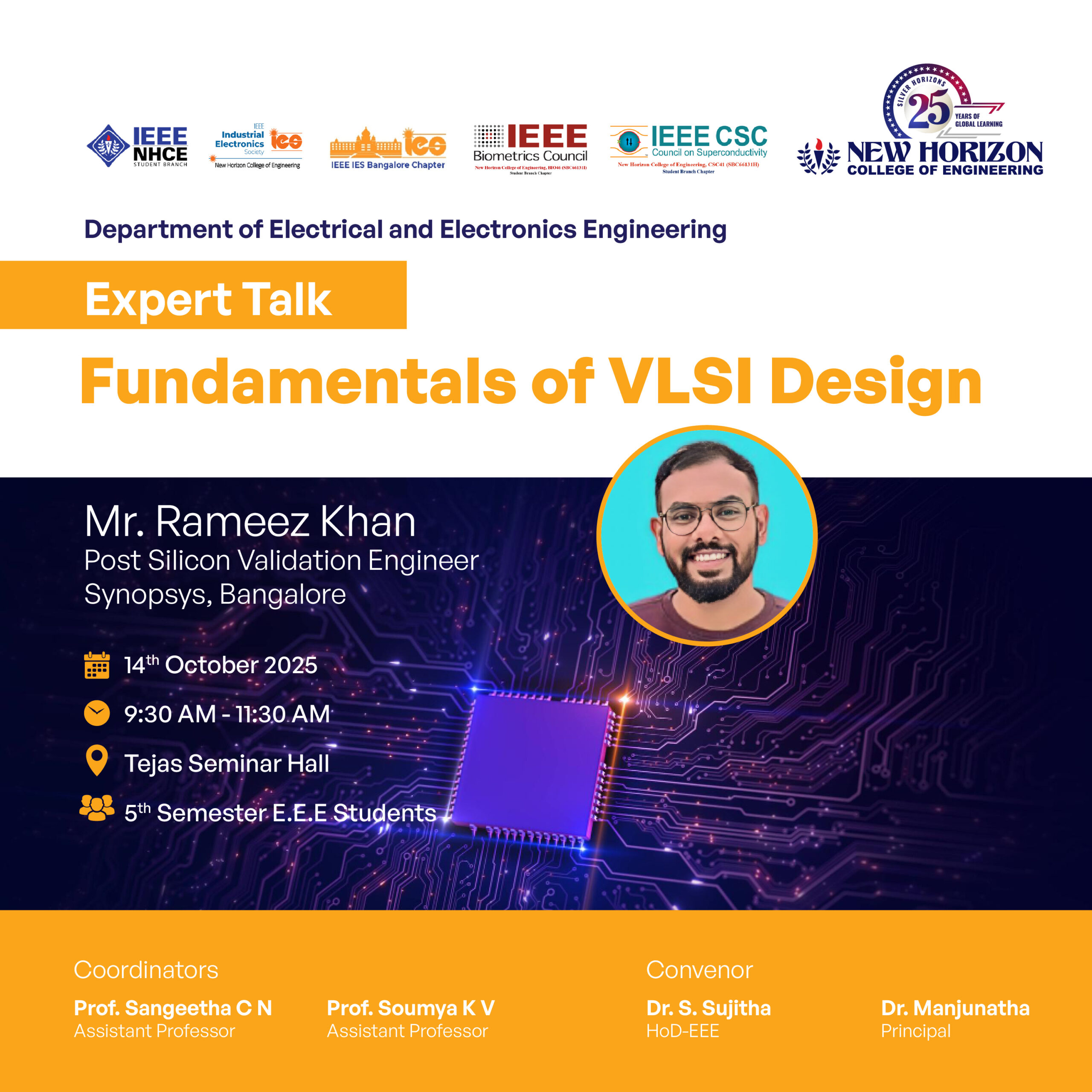 Department of Electrical and Electronics Engineering at New Horizon College of Engineering organized an Expert Talk on “Fundamentals of VLSI Design” on 14th October 2025. The session was delivered by Mr. Rameez Khan, Post Silicon Validation Engineer at Synopsys, Bangalore.