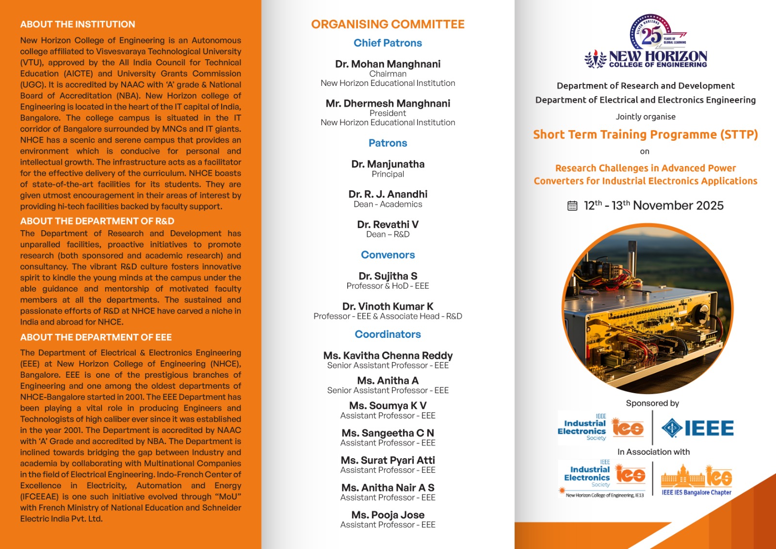 An advanced training program focusing on cutting-edge challenges in the field of power electronics as they apply to industrial settings. Hosted by the renowned New Horizon College of Engineering in Bangalore, the event is organized by experienced faculty and supported by prominent industry associations such as IEEE and ICE. It targets academics, researchers, and industry professionals interested in the latest developments and research trends in power converters for industrial applications. The event underscores NHCE’s commitment to research-driven education and industry collaboration, highlighting its well-established R&D and EEE departments