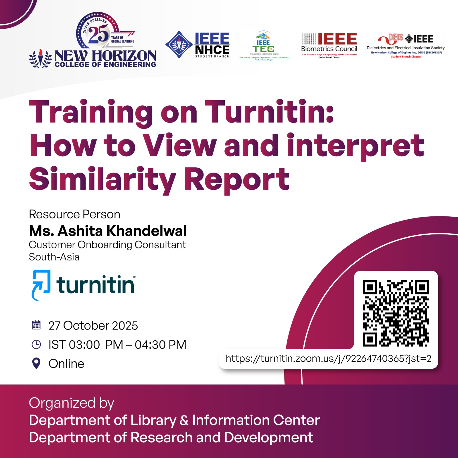 This session aims to help faculty and researchers understand the Turnitin similarity report, interpret results accurately, and uphold academic integrity in research and publications. The session will be conducted by delegates from Turnitin